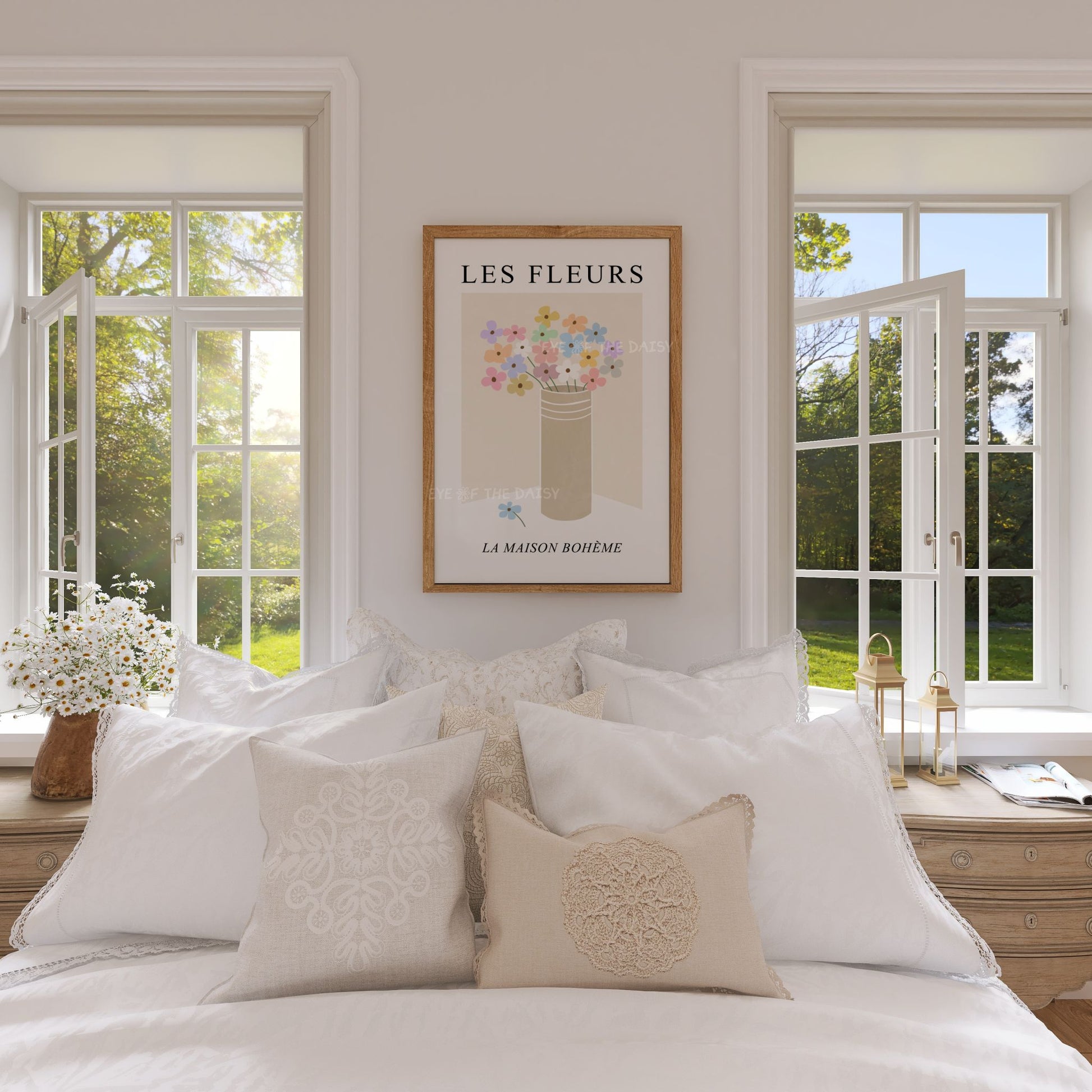 This boho chic Les Fleurs artwork features a bouquet of pastel flowers in a beige vase, set against a neutral background. It’s a sophisticated yet playful piece that adds a gentle touch of French charm to any space. Perfect for brightening up a modern living room, bedroom, or cosy nook.