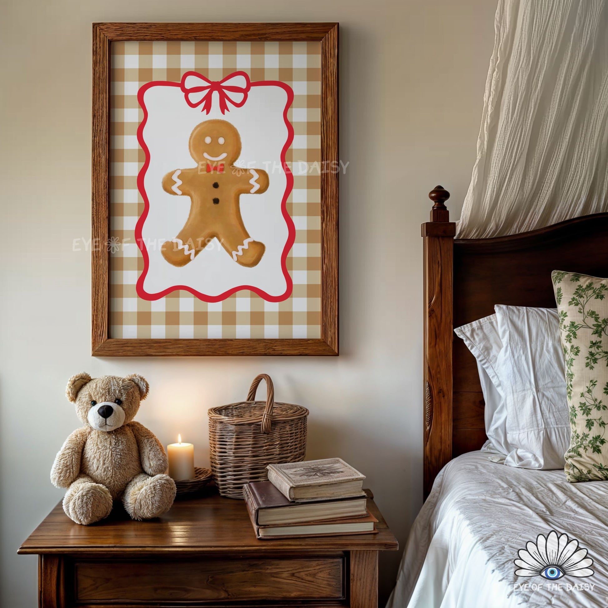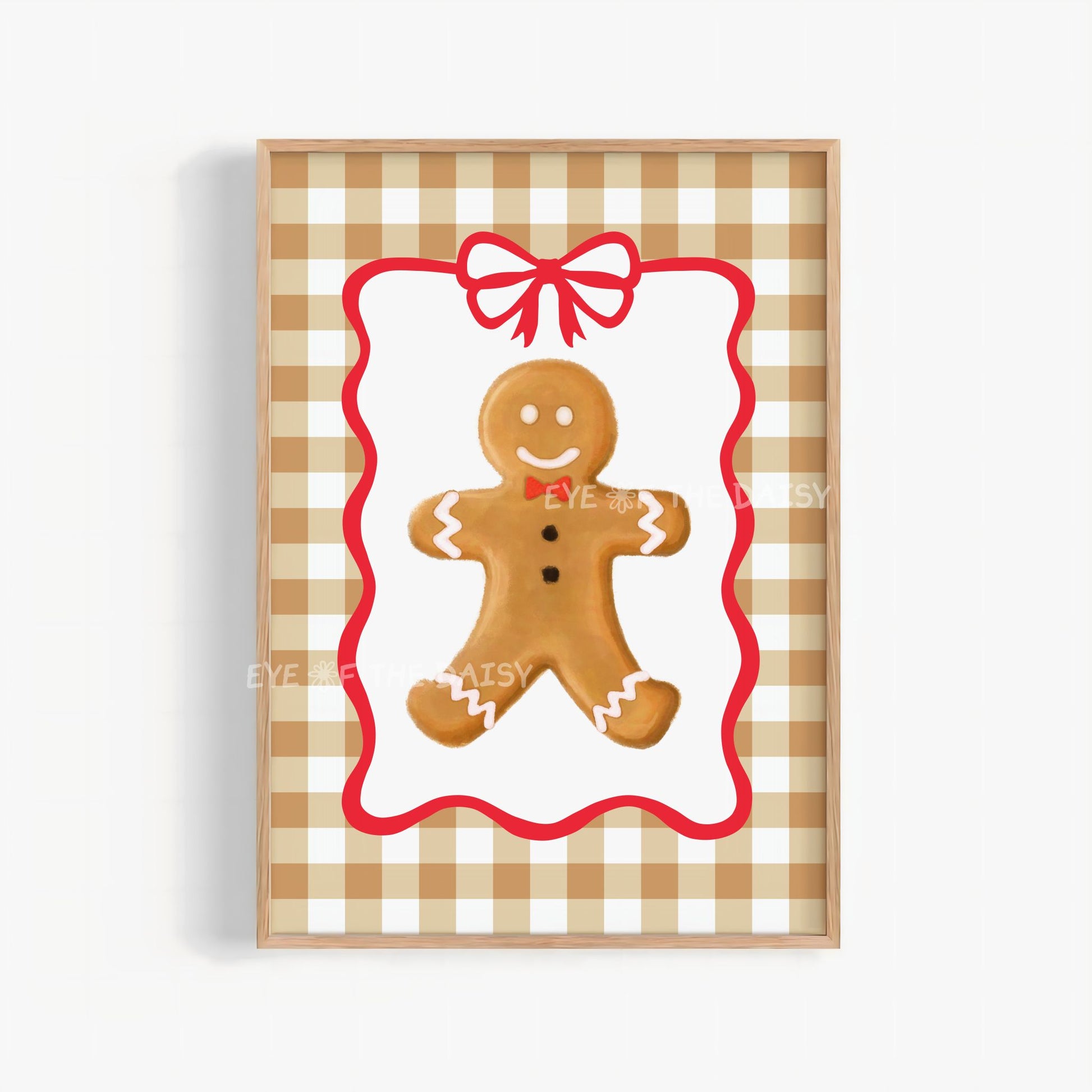 Bring festive warmth to your home this Christmas with my beige & red gingham Christmas printable wall art, featuring a cute hand drawn gingerbread man in a traditional vintage style. Ideal for adding a coquette holiday accent to any kitchen or living room!