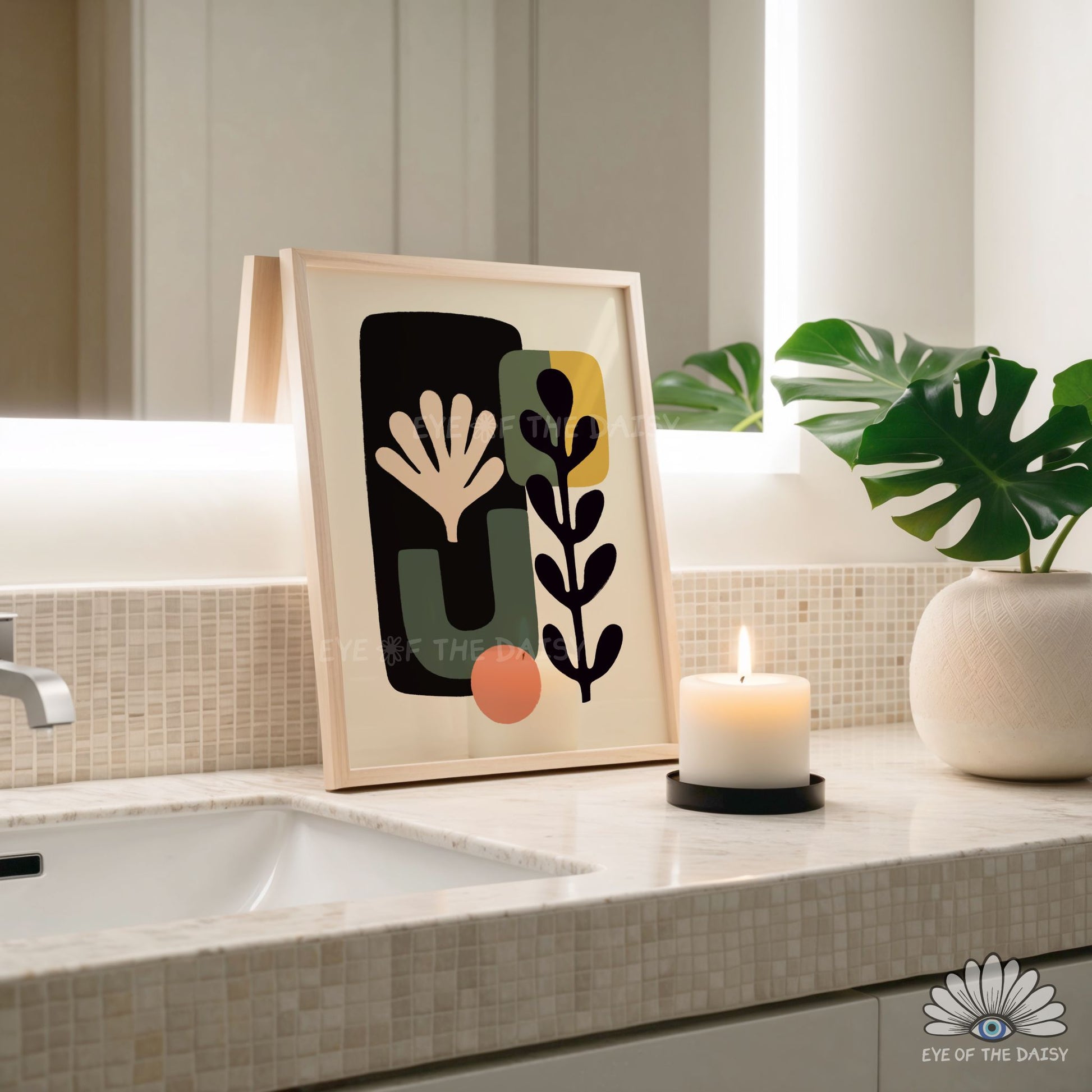 My hand drawn boho botanical printable wall art features an abstract leaf and organic shapes in warm earthy tones of beige, terracotta, mustard and olive green. Minimal yet eclectic, it brings a boho, mid century modern vibe to any space, adding a touch of colour and style to your walls!