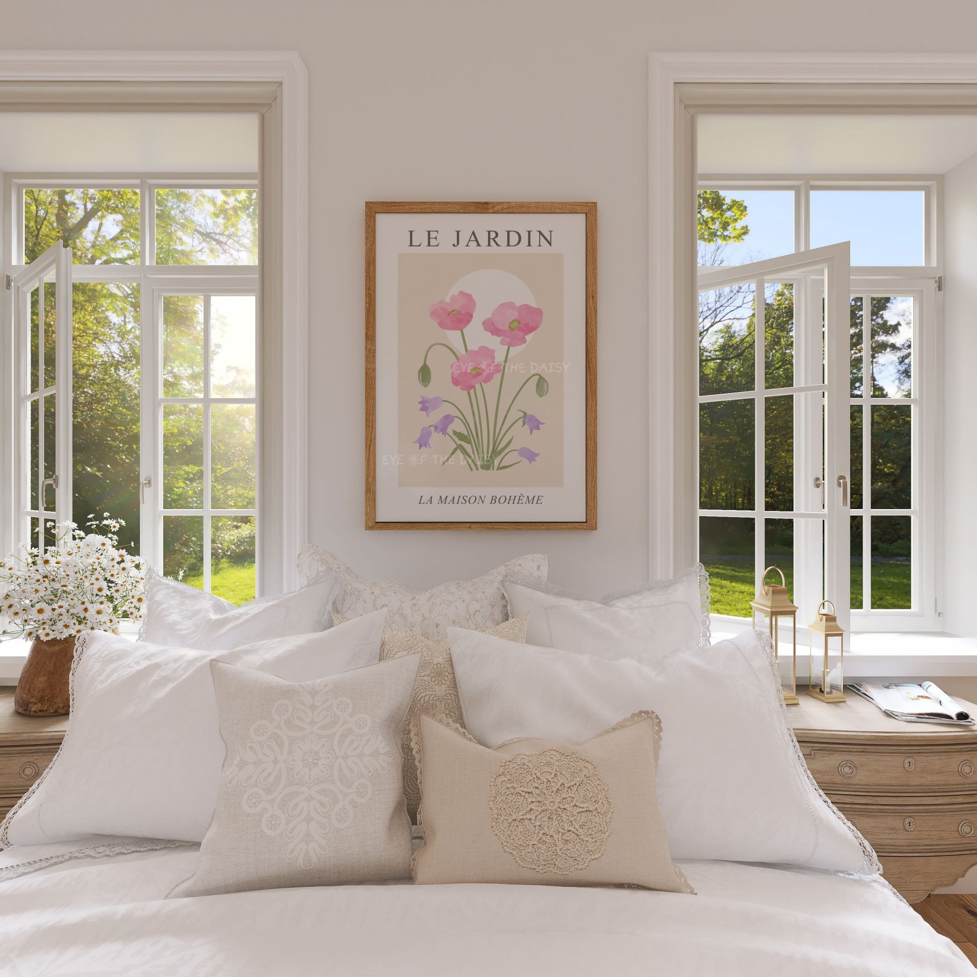 This modern Le Jardin artwork features soft pastel pink poppies against a light beige background, finished with a white border in a stylish exhibition poster style. It’s a versatile and elegant botanical piece that fits beautifully in modern, boho chic, or Scandinavian-inspired spaces. Perfect for adding a gentle, sophisticated touch to a living room, bedroom, or even a nursery.