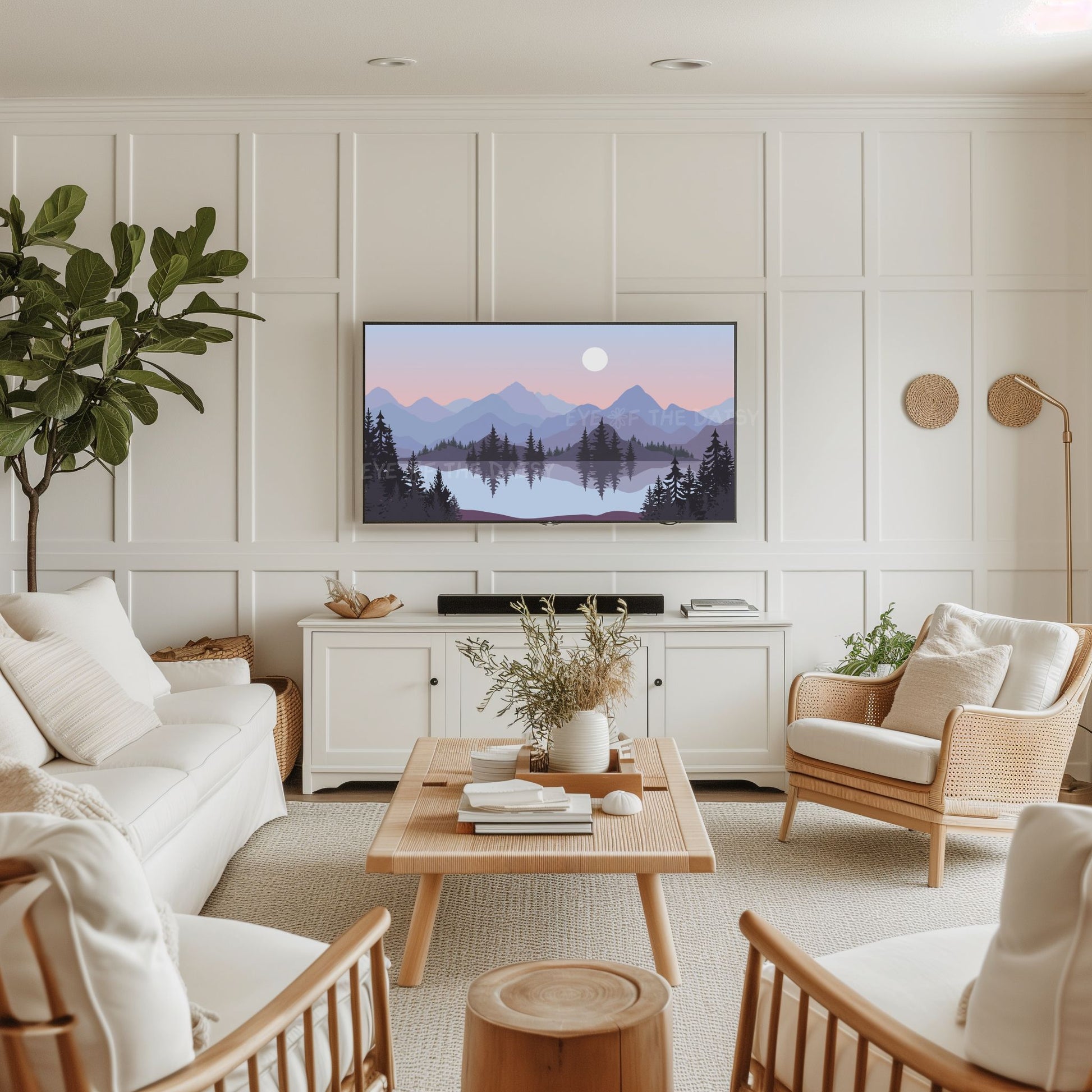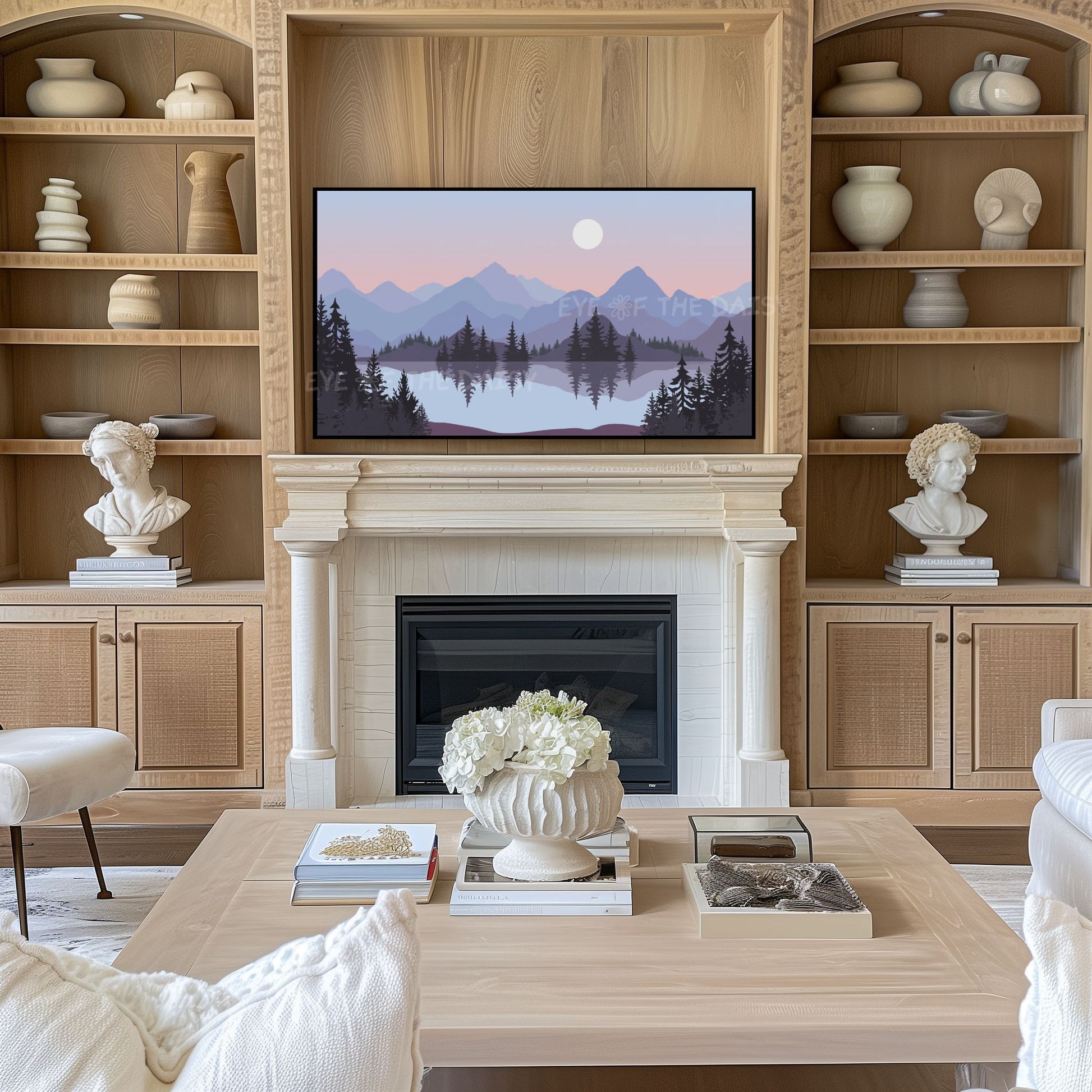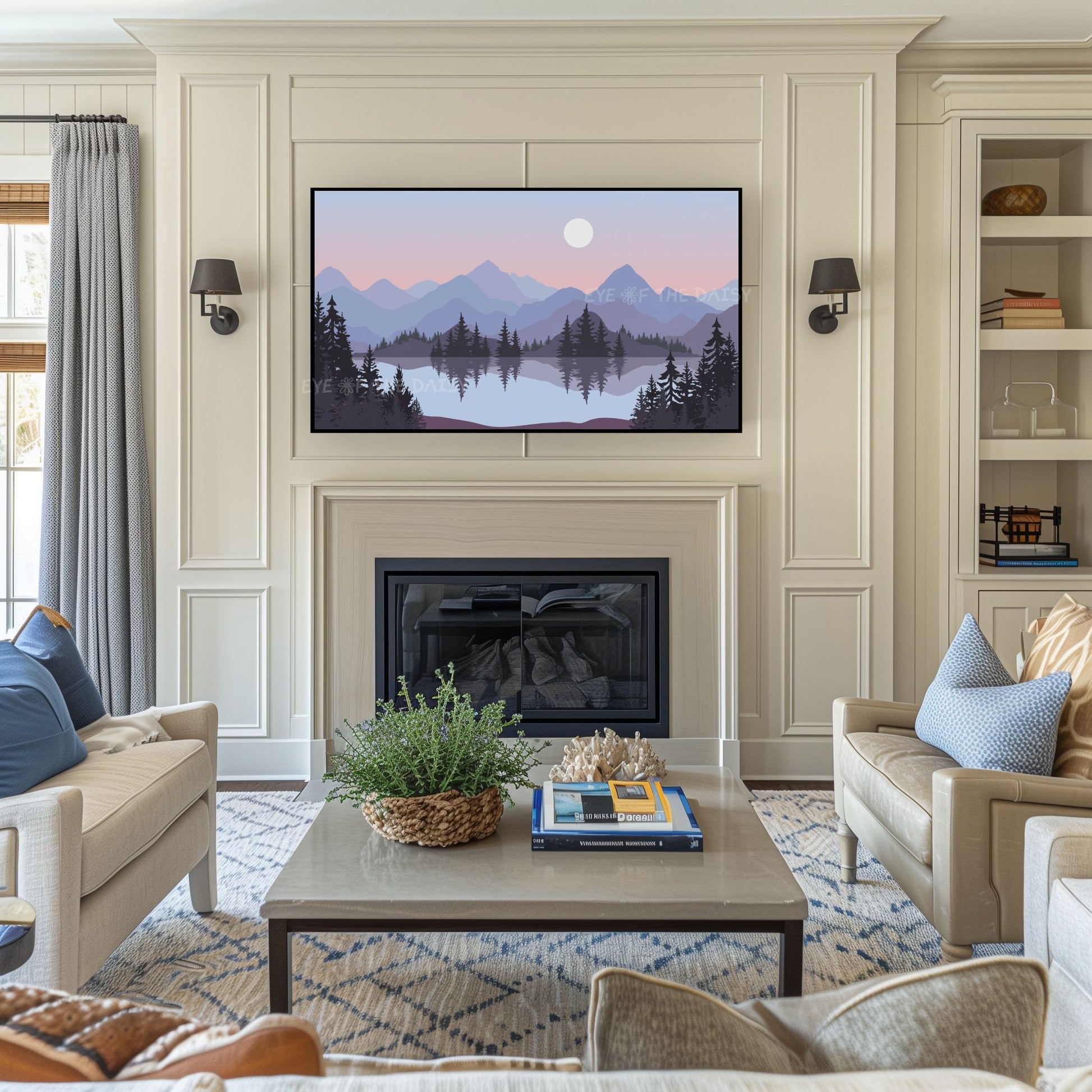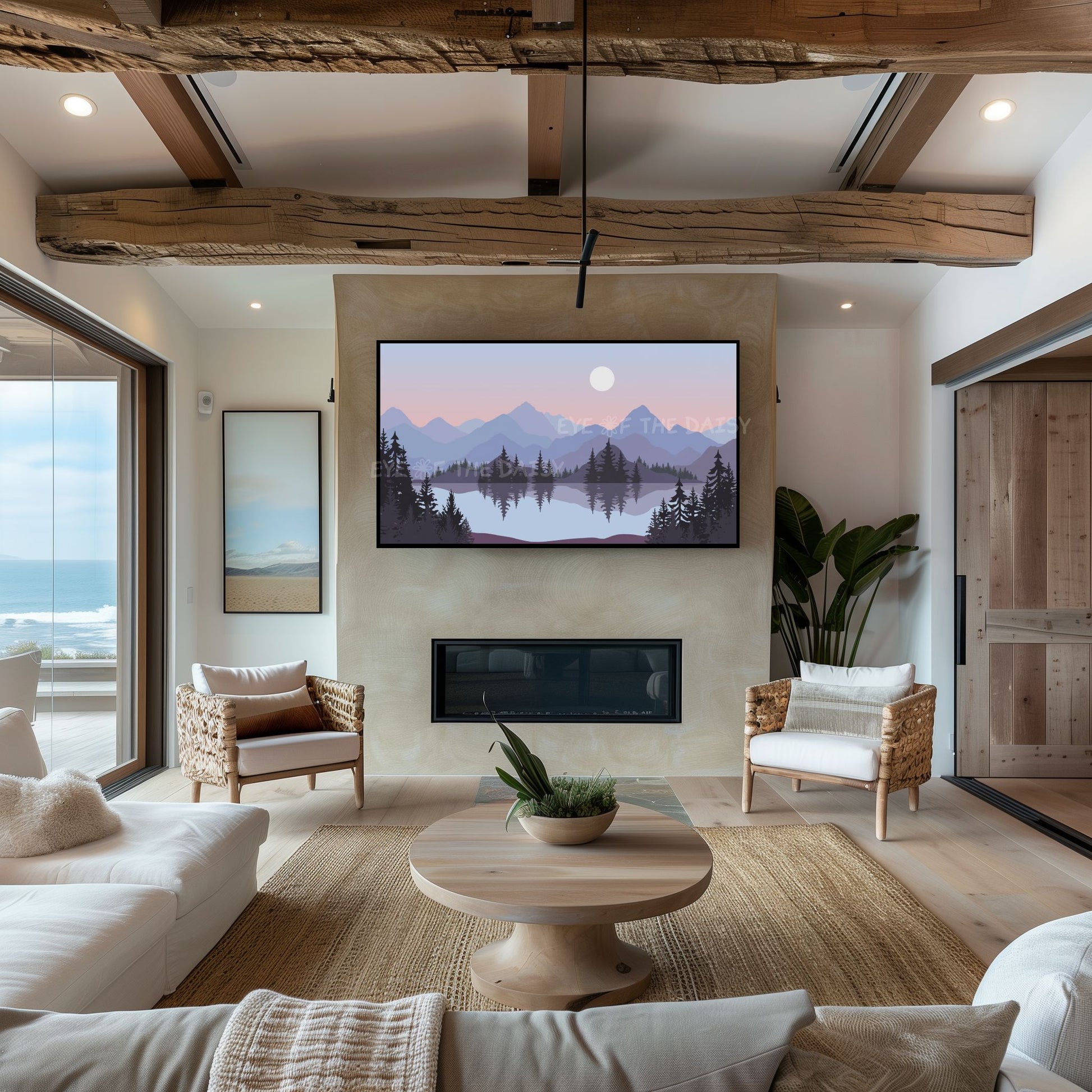 Lilac Blue Peach Landscape TV Art 4K | Mid Century Modern Mountain Lake Trees TV Art