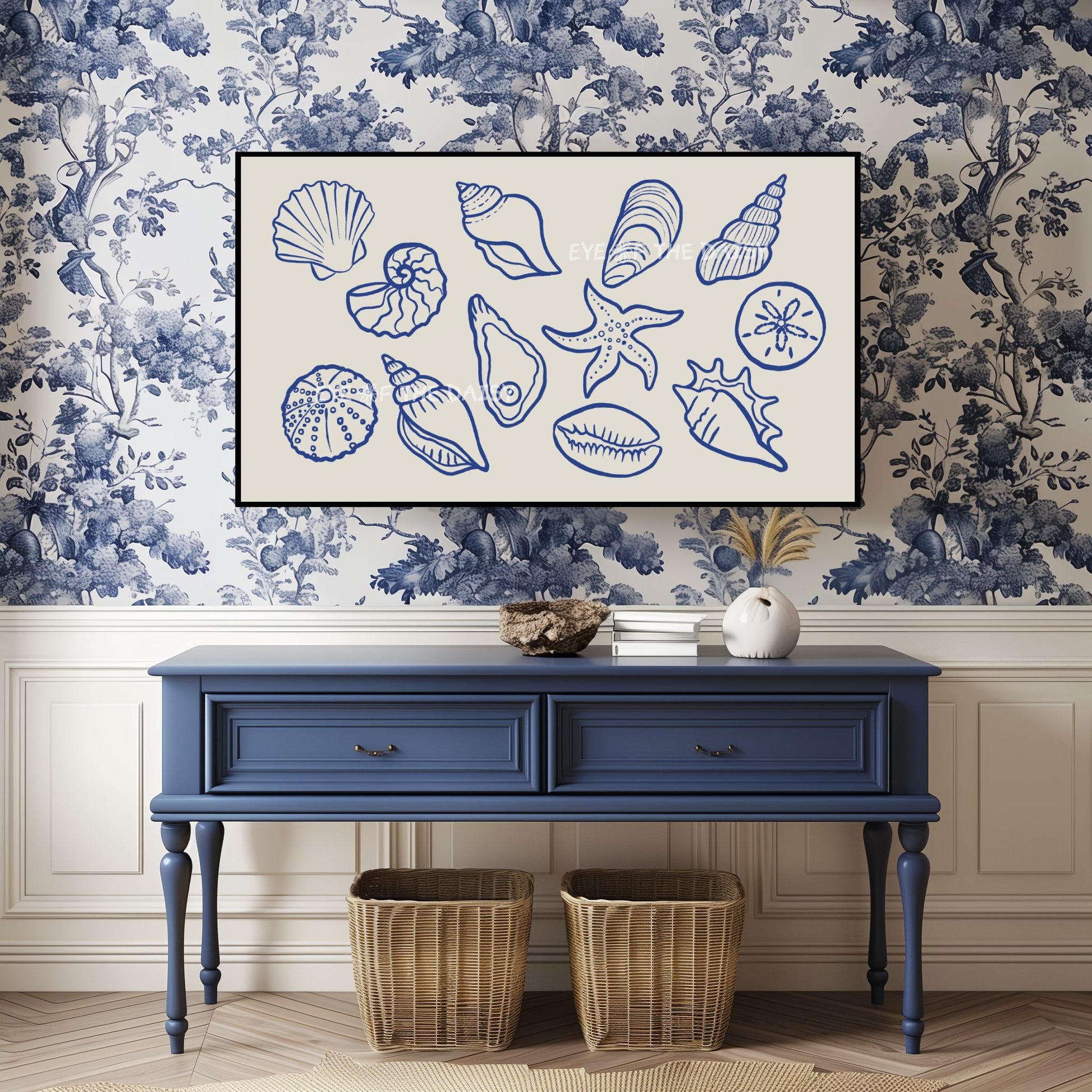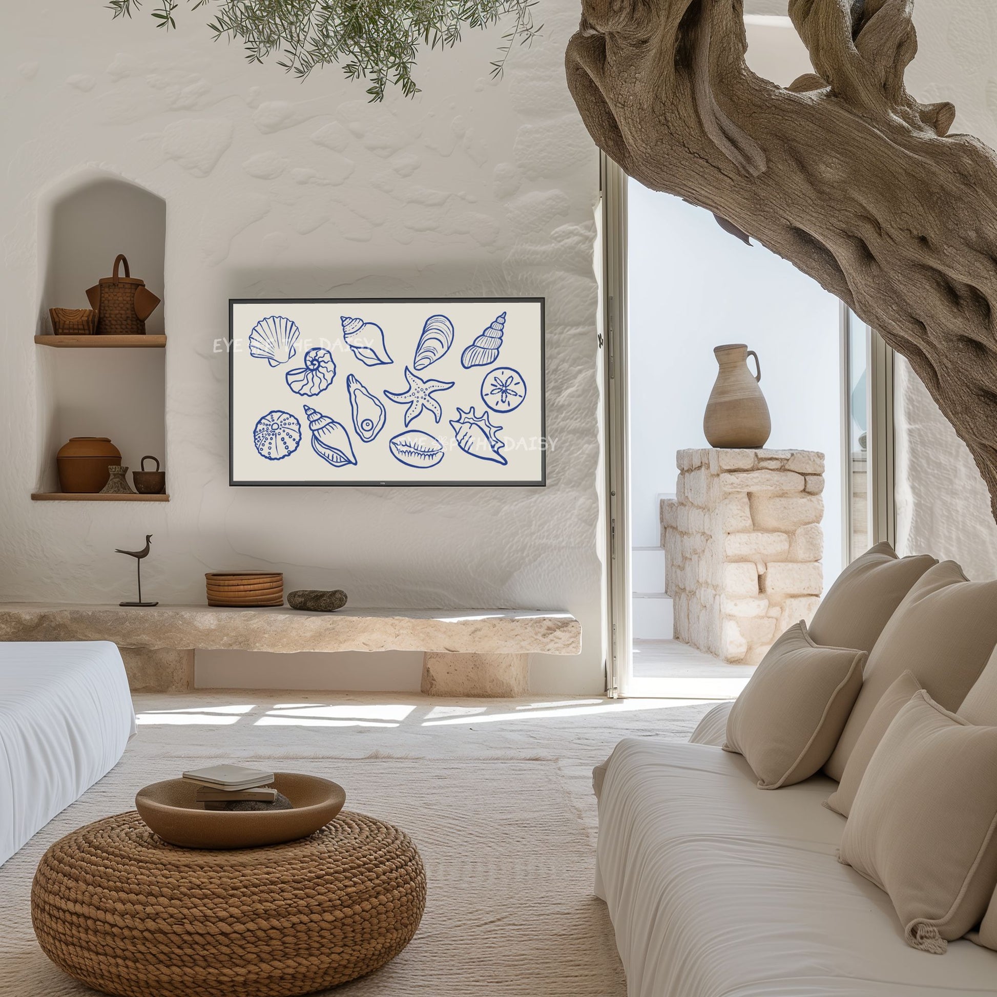 Navy Blue Beige Minimal Shells Sketch 4K TV Art | Modern Hamptons Coastal TV Artwork