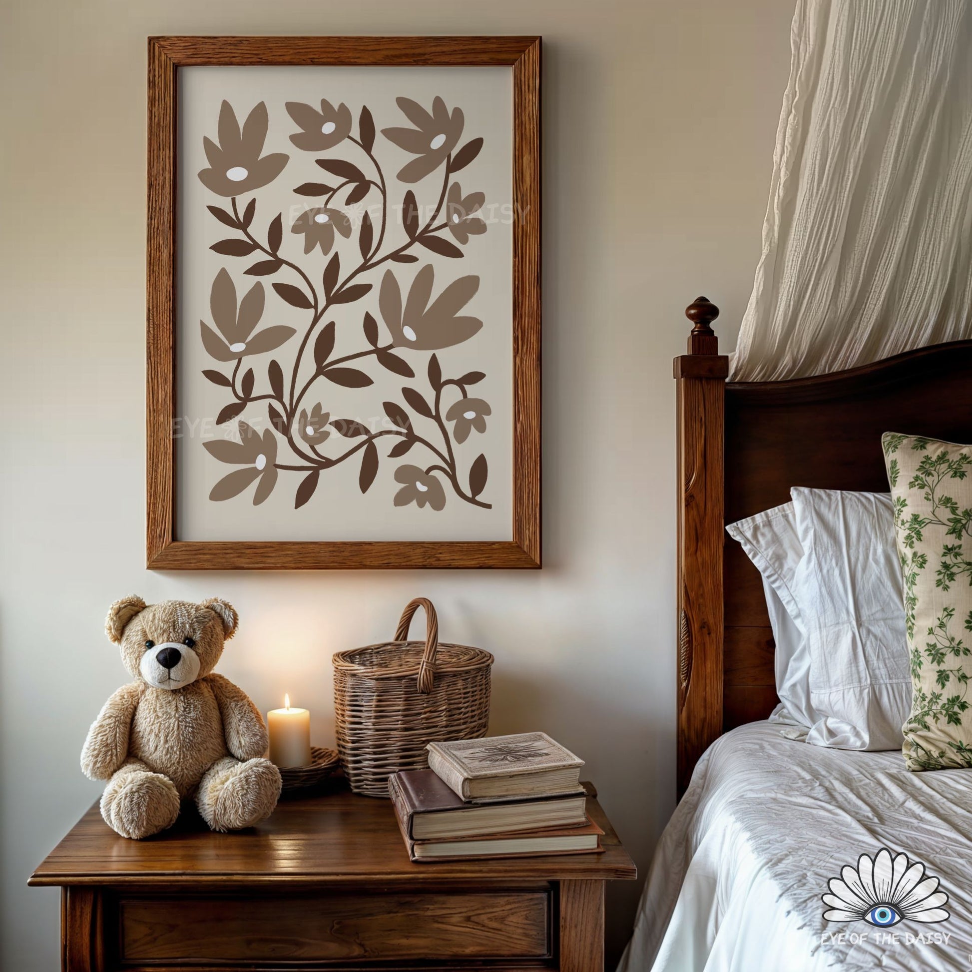 Neutral brown and beige abstract botanical printable wall art inspired by Scandi, boho, and Japandi interiors. Featuring my hand drawn abstract florals in warm, earthy tones, this minimal design blends organic shapes with a clean, modern feel, bringing quiet warmth to any serene, thoughtfully styled space.
