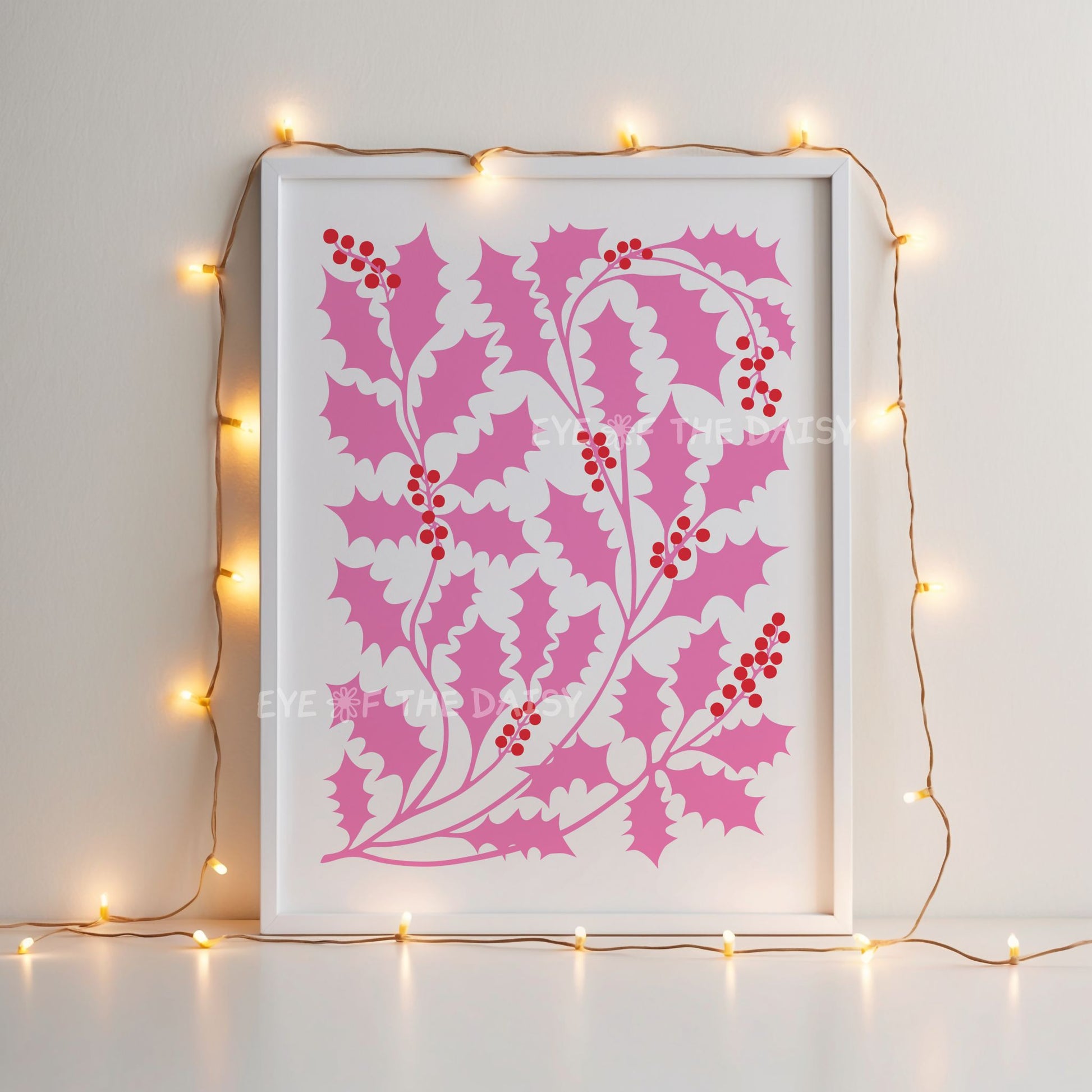 Pink Abstract Holly Print Download | Vibrant Modern Christmas Printable Wall Art