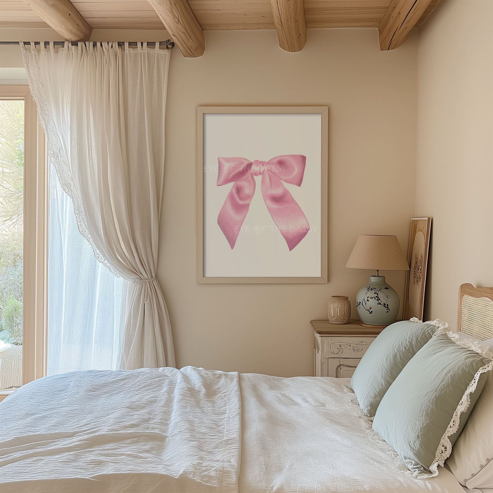 Bring a soft, feminine touch to your space with this set of three trendy pink watercolour bow & ribbon artworks. Perfect for coquette, coastal cowgirl, balletcore, grandmillennial, or cottagecore inspired interiors, these prints add a playful yet polished vintage feel to any bedroom, nursery or children's room.