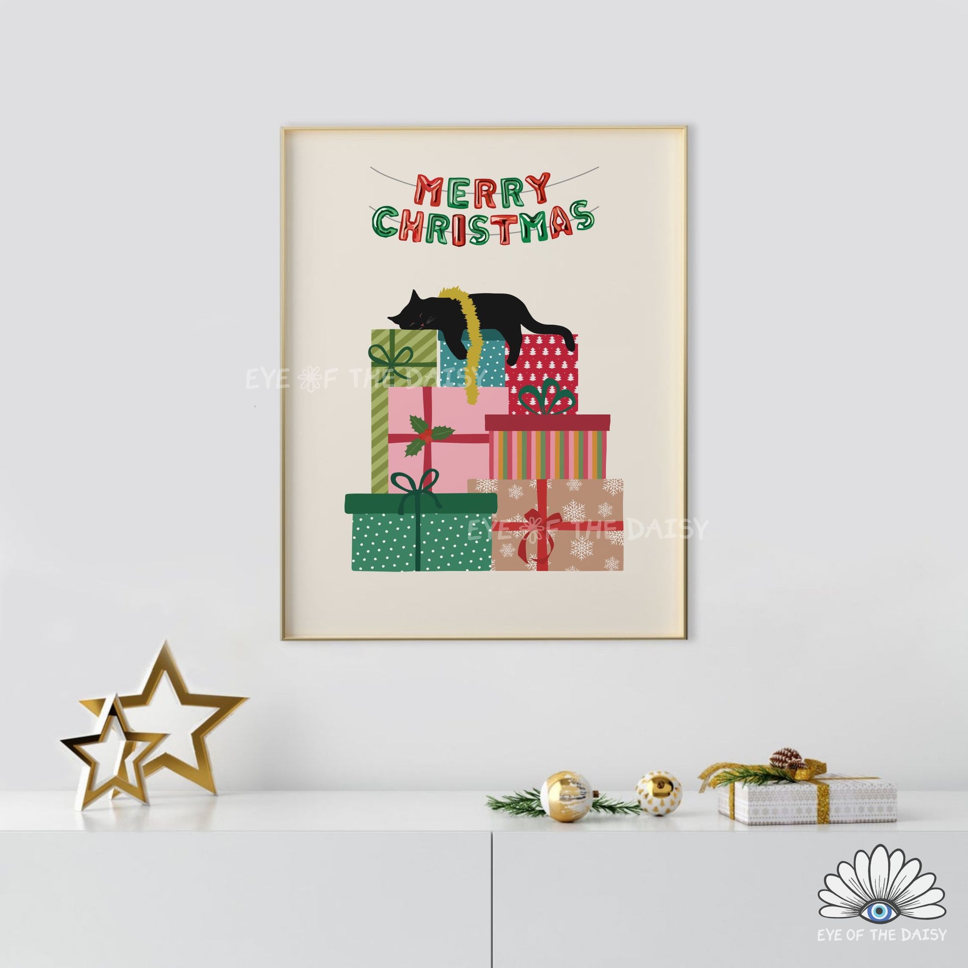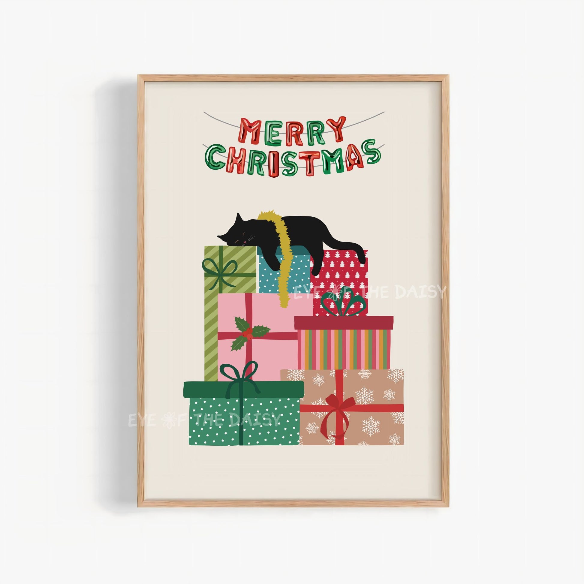 Add a touch of festive charm to your walls with my hand drawn sleeping black cat, curled up on a pile of colourful presents digital print. Cute and cozy, it’s perfect for bringing a playful holiday vibe to any space and would make a great gift for a cat lover!